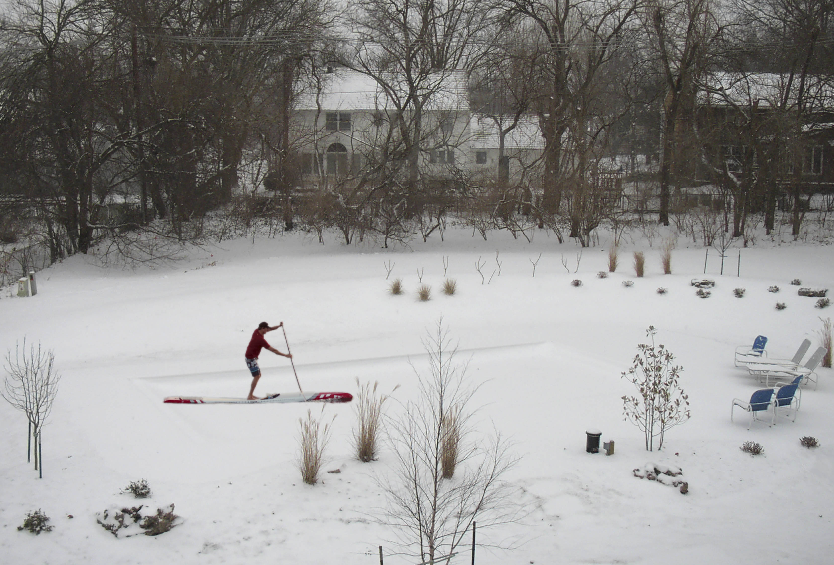 After I finished the edit, I was dissatisfied with the result. The white of the paddleboard is bluer and brighter than the snow, which is a tintless gray. It makes the paddleboarder look like he was pasted on.
