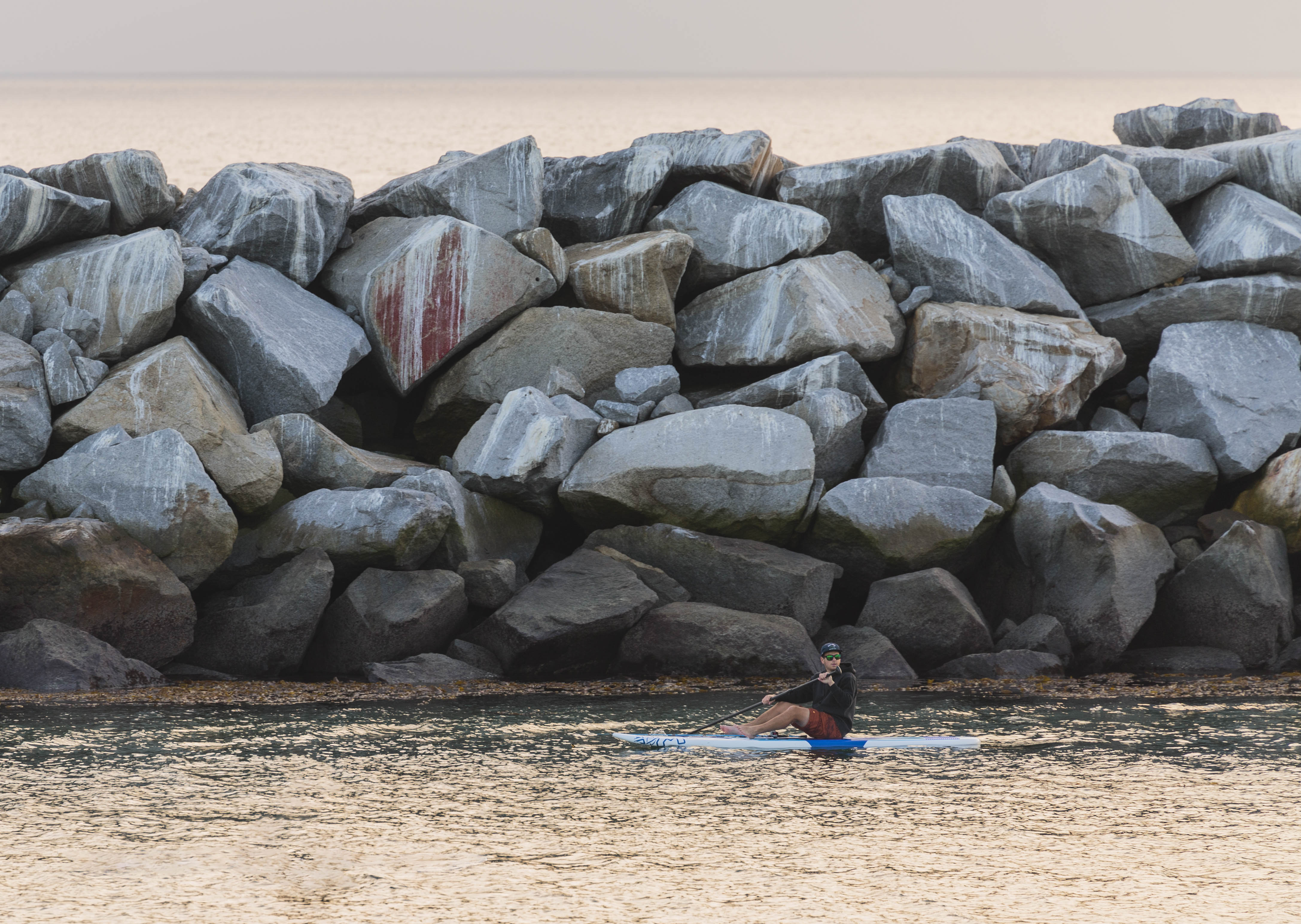 Less is more. I used content aware fill in Photoshop to remove the left paddle boarder and then healing brush to clean up the edges. Next I cropped, balancing the red features on the rock looming above the paddleboarder to his red swimming trunks.