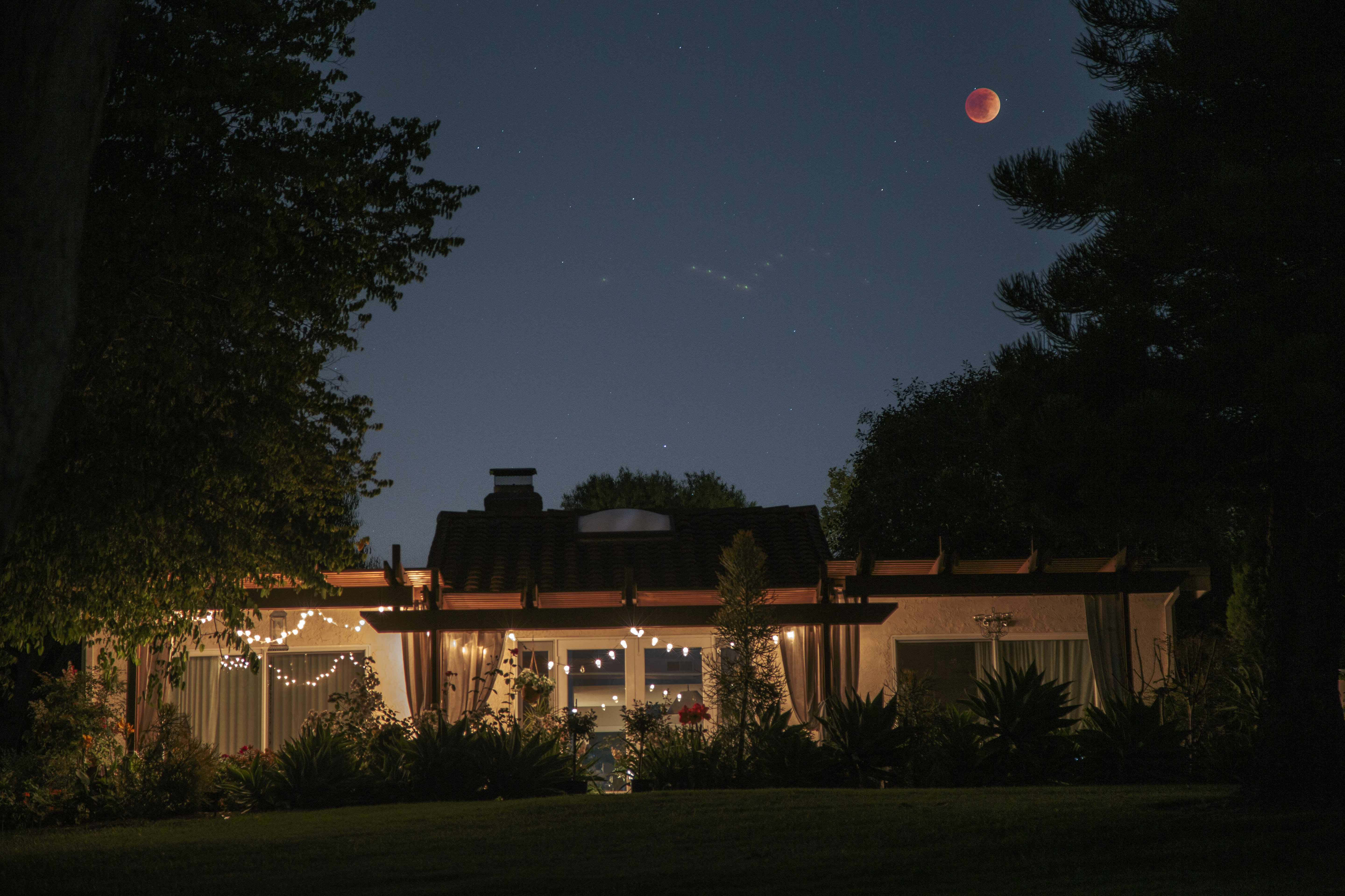 This is the lunar eclipse of May 15, 2022. The moon rose in eclipse in southern California. The bright v-shape above the house is an array of just-launched and released communication satellites.