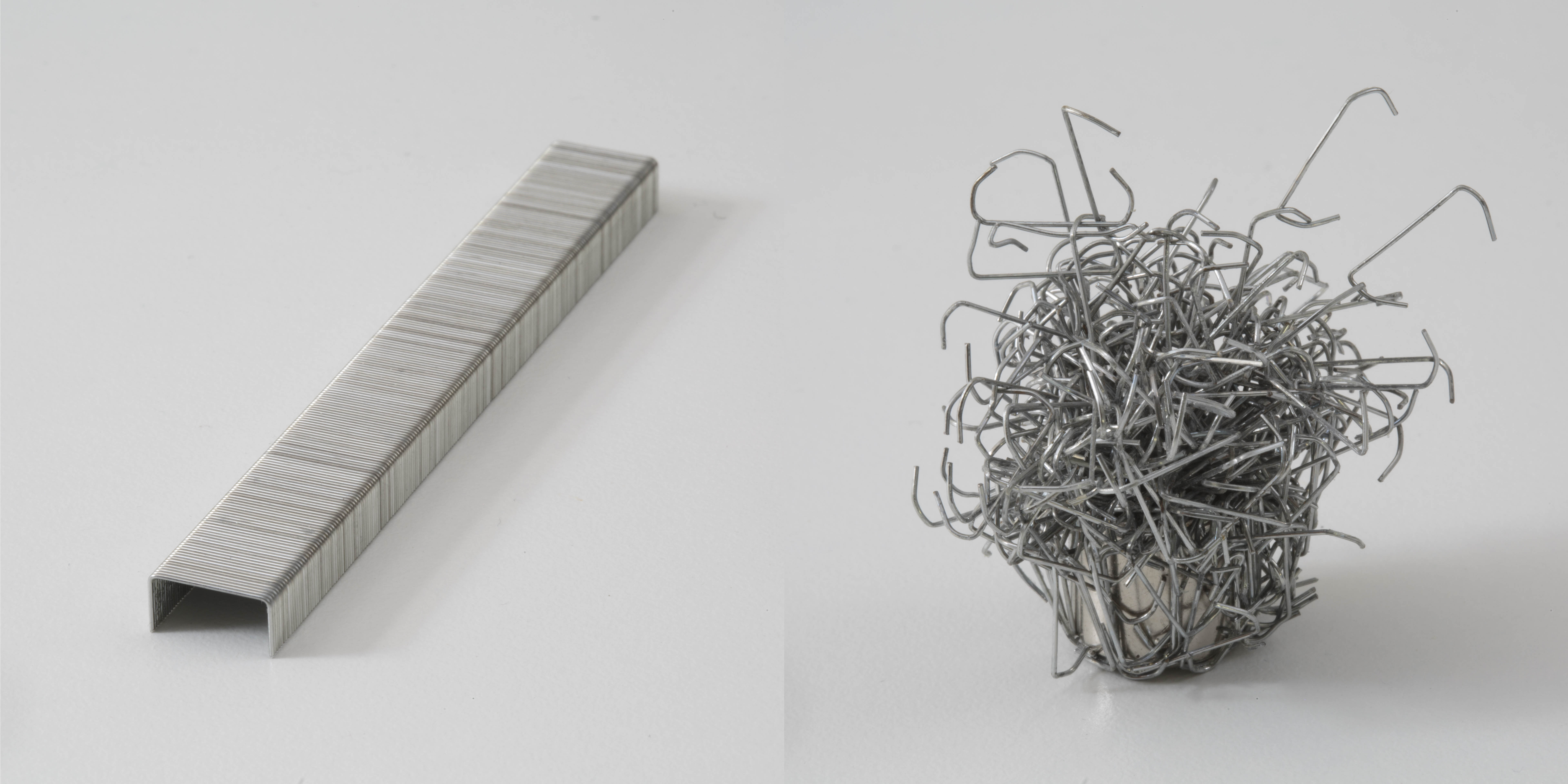 I recently finished a genealogy project in which I scanned over 2000 pages of correspondence collected by a famly researcher. He had stapled together every message of 2 pages or more. I decided early on to save the staples as a visual measure of the work done. I tossed them onto a small rare earth magnet. The complexity image shows these used staples. The simplicity image shows a strip of 50 staples.