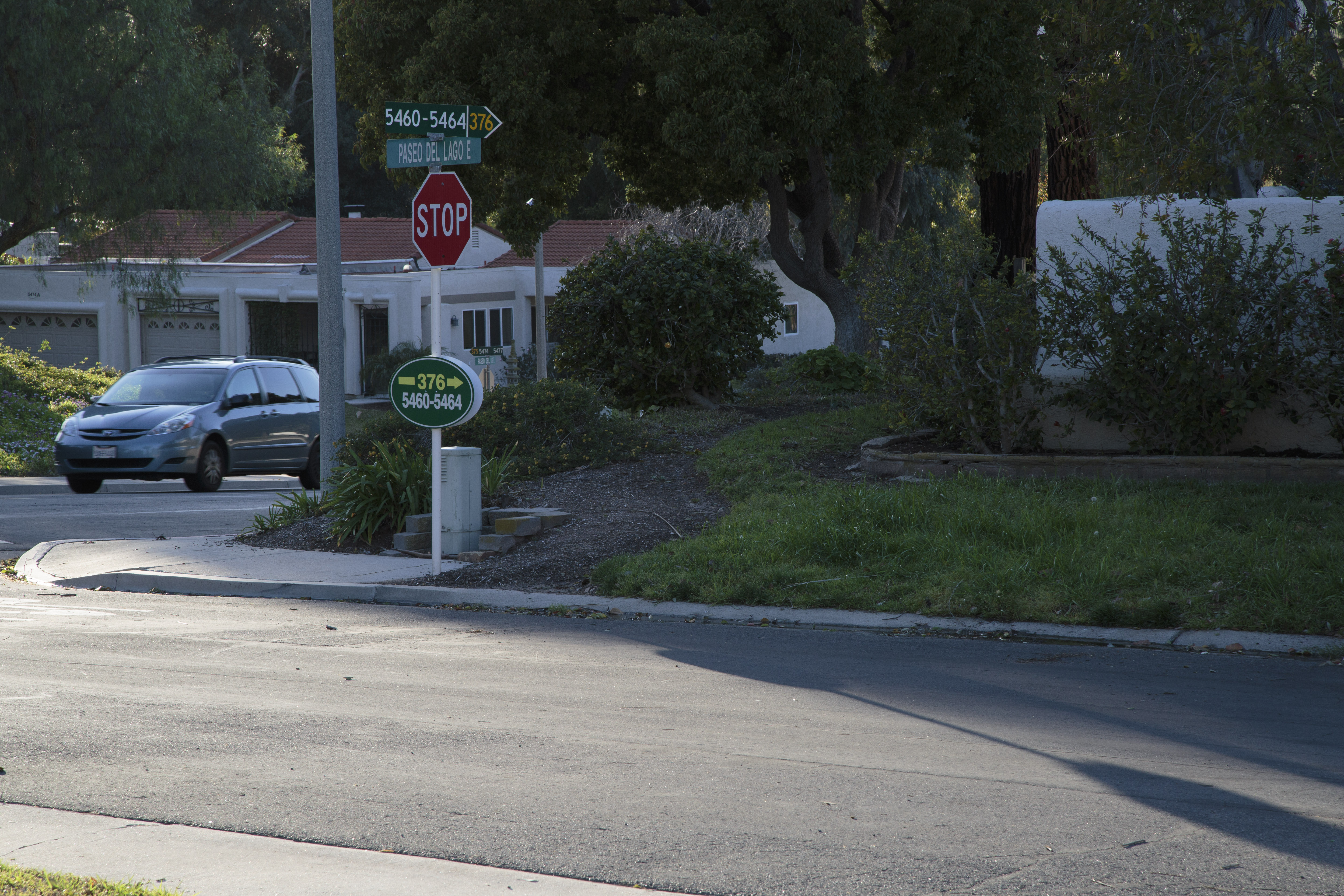 This image was shot at 4:46, 13 minutes after the first shot. The shadow of the stop sign is partially obscured by the shadow of the trees. The main road is entirely in shadow. At 10 fps this is the best framed shot in the sequence of the automobile coming up the main road.